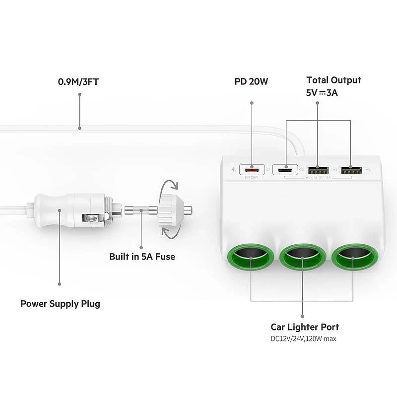 - Safety Measures: This 12V/24V car lighter splitter features full protective circuits and a smart chip to protect against over-voltage, over-loading, over-heating, short-circuiting, over-current, and over-charging. Includes a built-in replacement safe fuse and 2 spare fuses. Package contents: 1 Car Cigarette Lighter USB Charger, 1 Velcro, and 2 Spare Fuses. Comes with a 12-month warranty.